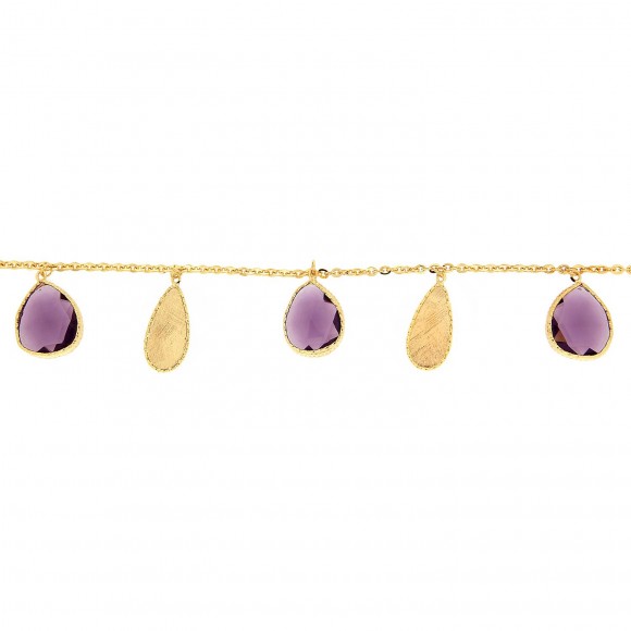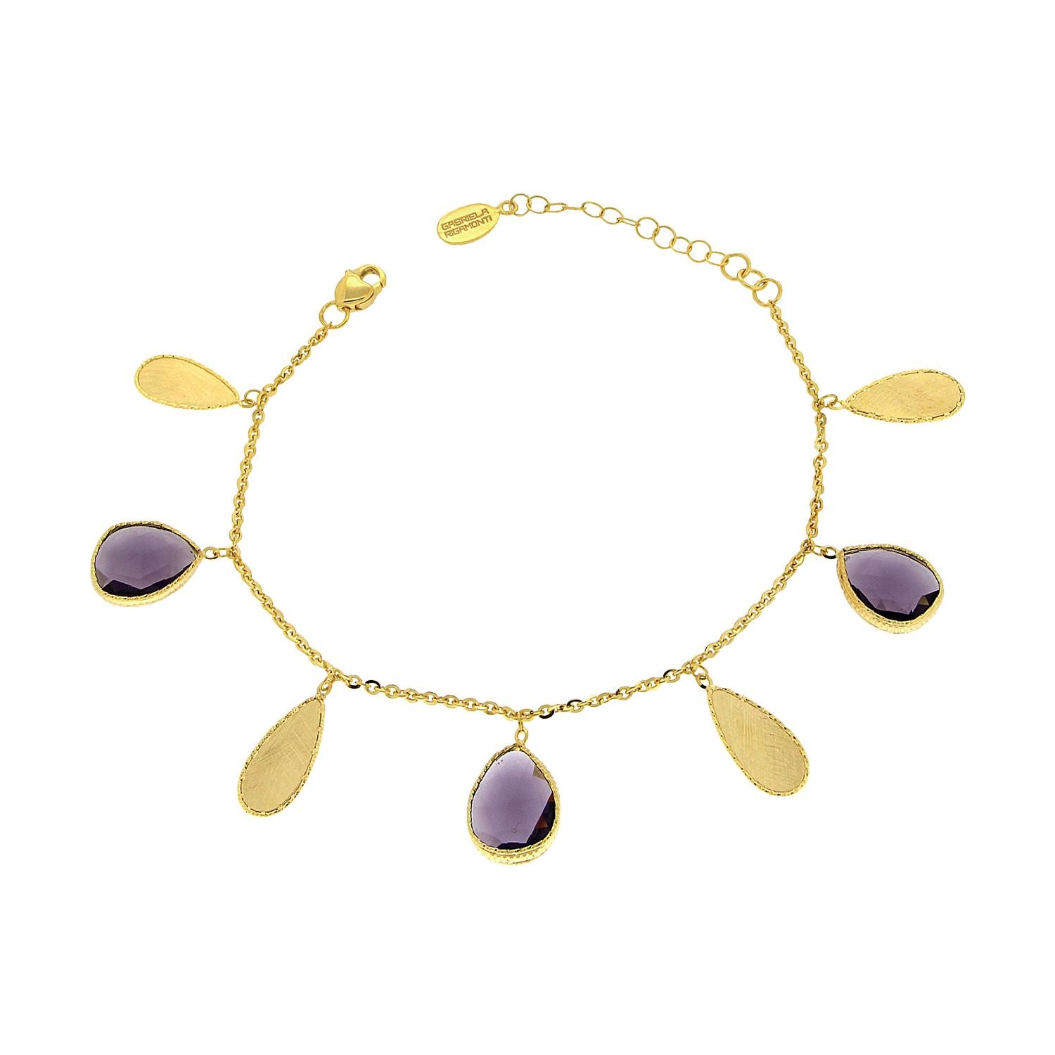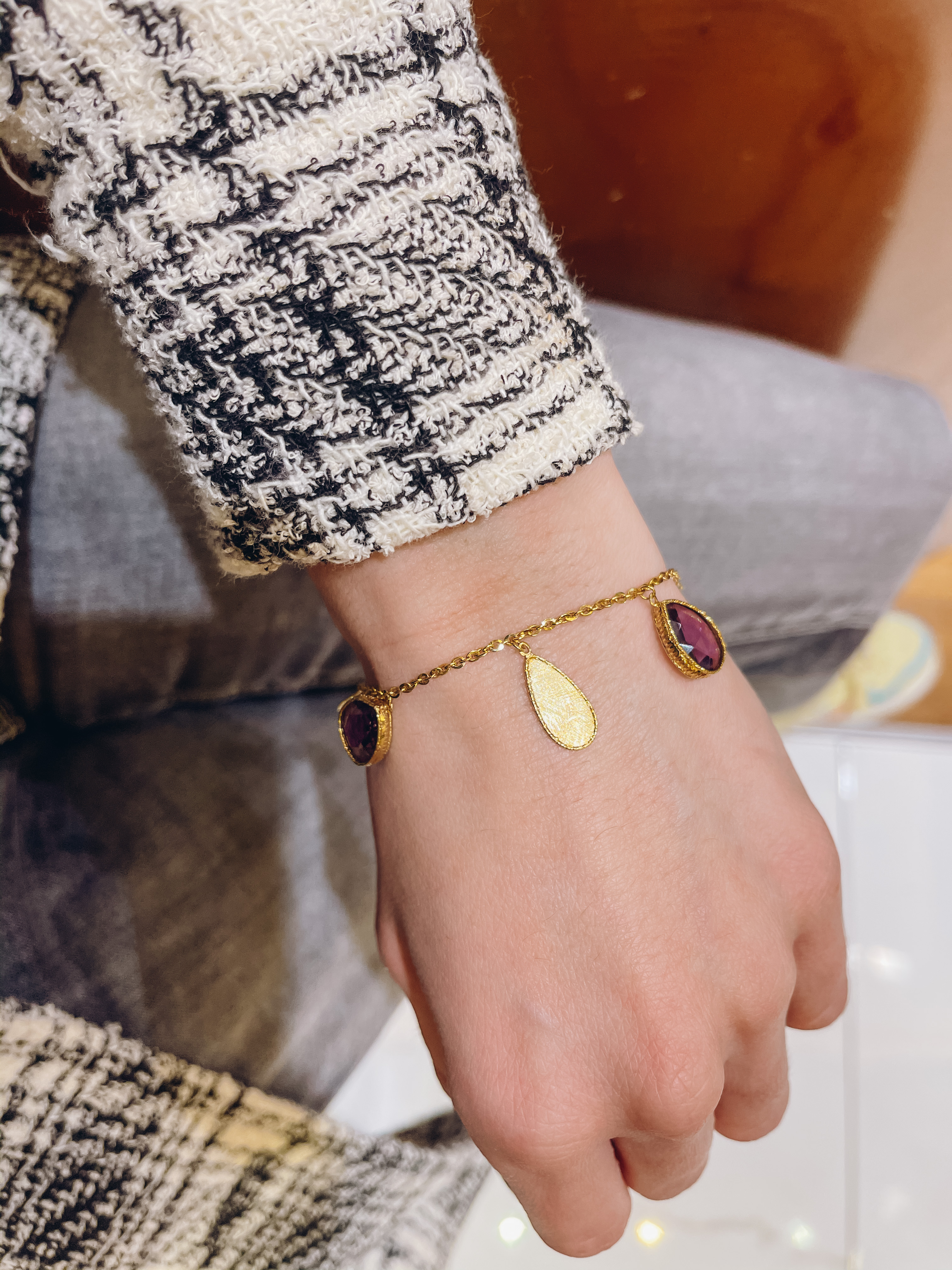 Ένα ιδιαίτερο βραχιόλι από τη γνωστή ιταλίδα σχεδιάστρια Gabriela Rigamonti σε κίτρινο χρυσό δεκατεσσάρων καρατίων (κ585). Αποτελείται από ορυκτές πέτρες αμέθυστους και πλάκες χρυσές ματ σε σχήμα δάκρυ. Το μήκος του βραχιολιού μπορεί να κυμανθεί μεταξύ 18 και 21.50 εκατοστών, αναλόγως σε ποιον κρίκο θα κουμπώσει.