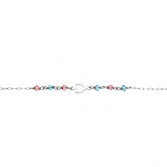 Μοντέρνο, παιχνιδιάρικο, πολύχρωμο βραχιόλι από λευκόχρυσο 9 καρατίων (375). Αποτελείται από charm καρδιά, κενή και σκέτη γυαλιστερή, στο κέντρο του και αμφίπλευρά της βρίσκονται χάντρες σε γαλάζιο και ροζ χρώμα. Όλα τα charms είναι ενσωματωμένο επάνω στην αλυσίδα.