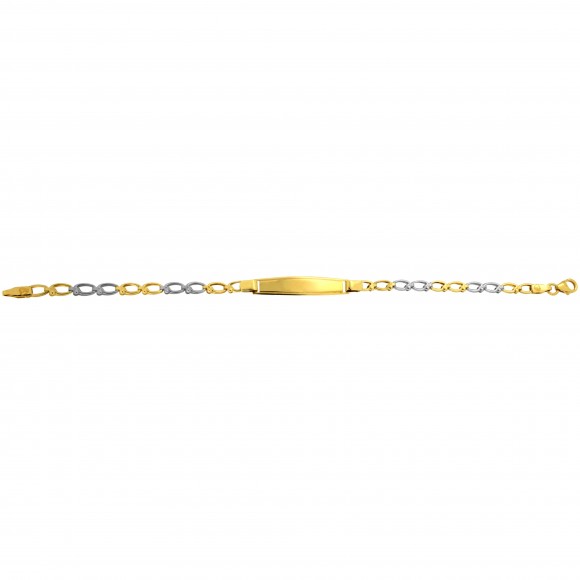 Iδιαίτερα εντυπωσιακό, δίχρωμο και minimal βραχιόλι ταυτότητα από λευκόχρυσο 9 καρατίων με χοντρή αλυσίδα, που μπορεί να κουμπώσει σε όλους τους κρίκους της και να προσαρμοστεί εύκολα ακόμη και σε λεπτό παιδικό καρπό. Η πλάκα της ταυτότητας είναι σκέτη γυαλιστερή και περιέχει δύο οριζόντιες γραμμές επάνω και κάτω.